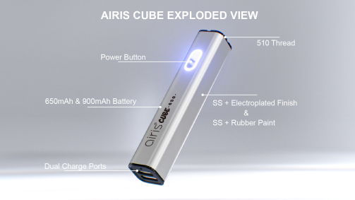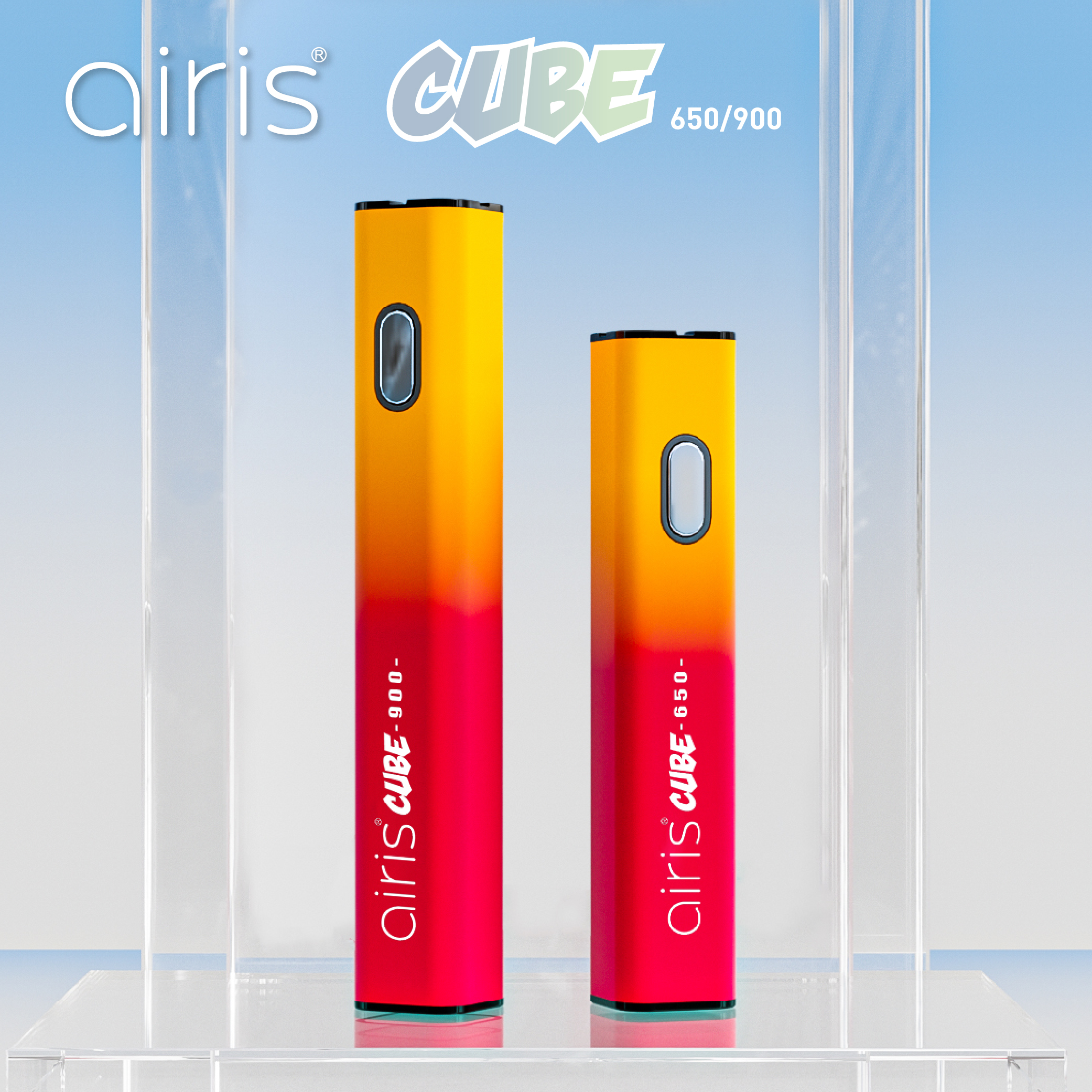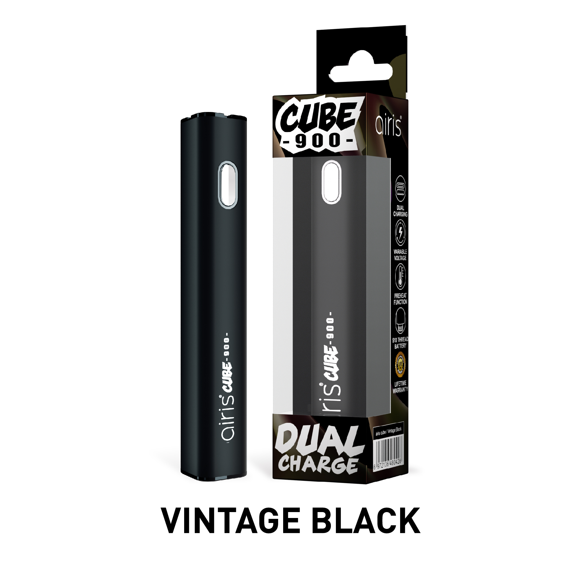 The Airis Cube 900 is a square 900mAh 510 thread battery with dual USB-C + Lightning charging, 3 voltages (3.4V–4.2V), preheat, and no-roll design that fits large 2g+ cartridges.