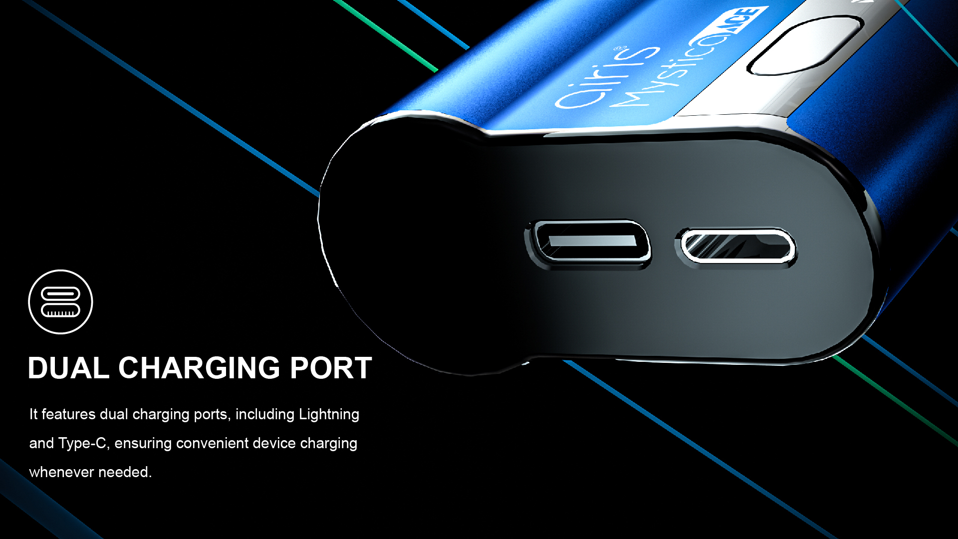 • Dual Charging Ports: USB-C and Lightning – charge with any cable