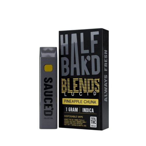 Half Baked Lucid Blends 1G Disposable: 50mg THC-B + 20mg THC-H + 400mg Delta-8 + 200mg CBG + 250mg CBD. Pineapple Chunk (indica) & Strawberry Jam (hybrid) flavors. Fast, discreet shipping!