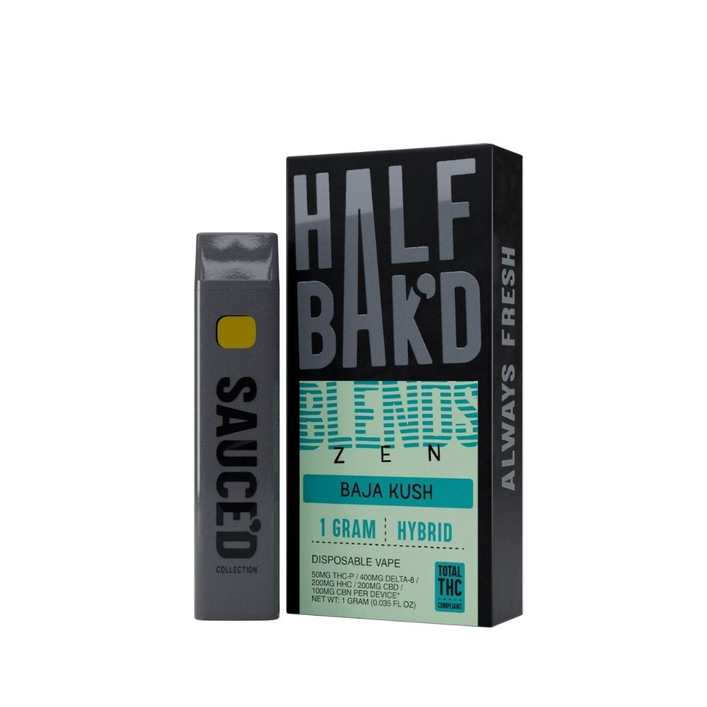 Half Baked Zen Blends 1G Disposable: 50mg THC-P + 400mg Delta-8 + 200mg HHC + 200mg CBD + 100mg CBN for deep relaxation and balanced calm. Available in Kiwi Berry (indica) and Baja Kush (hybrid). Fast, discreet shipping!