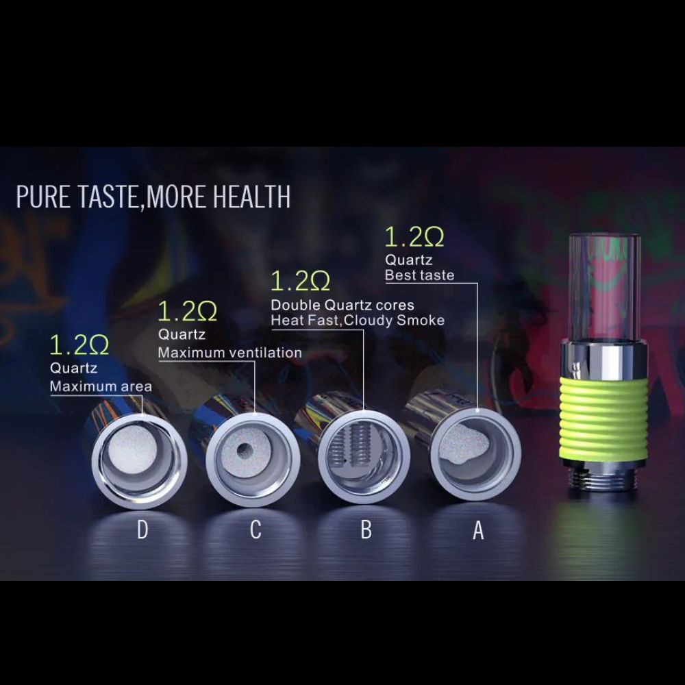 Lookah 510 quartz wax carts are a series of wax dab pen carts that use the best 1.2Ω quartz coils to provide the smoothest taste and for more enjoyable dabbing. Each pack contains 4 tanks and 1 mouthpiece tip. There are 5 options to choose from (see list below).