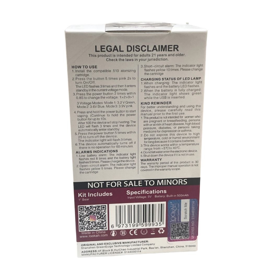 Power your carts with the Lookah Bear 510 vape battery—a fun, discreet teddy bear cart battery that blends in for unnoticed vaping. With variable voltage (2.4-3.3V), 350mAh battery, and colorful LED lights, it fits 510 threads perfectly for smooth, customizable hits. Compact and adorable—shop at Discount Vape Pen for fast USA shipping!