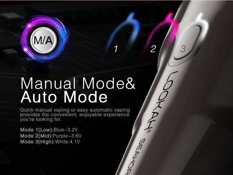 The Seahorse Max has two modes, a manual mode and an auto mode. In manual mode you set your temperature and hold the power button to dab and has a 20 second timer. In auto mode you click the power button three (3) times to activate auto mode, your device will begin the heat up process.