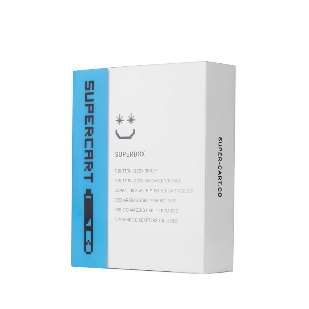 Power your carts with the SuperBox 510 Battery – a stylish translucent vaporizer from Supercart with 900mAh for all-day sessions and variable voltage (3.4V low/3.7V med/4.0V high) for perfect flavor/clouds. Pre-heat function melts thick oils, USB-C charges fast, and magnetic adapters (tall/short) + silicone rings fit any cart (11.5mm opening). 5-click on/off, 3-click voltage.