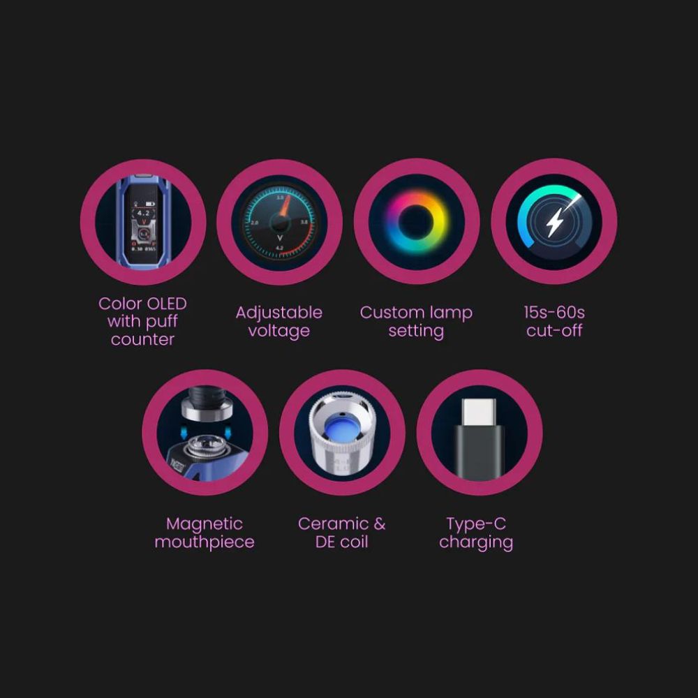 The dazzling rainbow LED lights are customizable and fun to play with. The silicone mouthpiece uses a magnetic link connection. Simply pull the mouthpiece away from the magnetic atomizer base, to reveal the coil. Use the dab tool (included) to scoop wax into the coil, reattach the mouthpiece, and enjoy! The Yocan Cylo was awarded top staff pick in our Best Wax Pen shortlist!