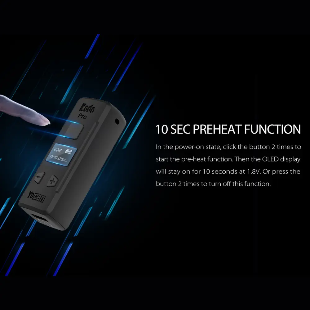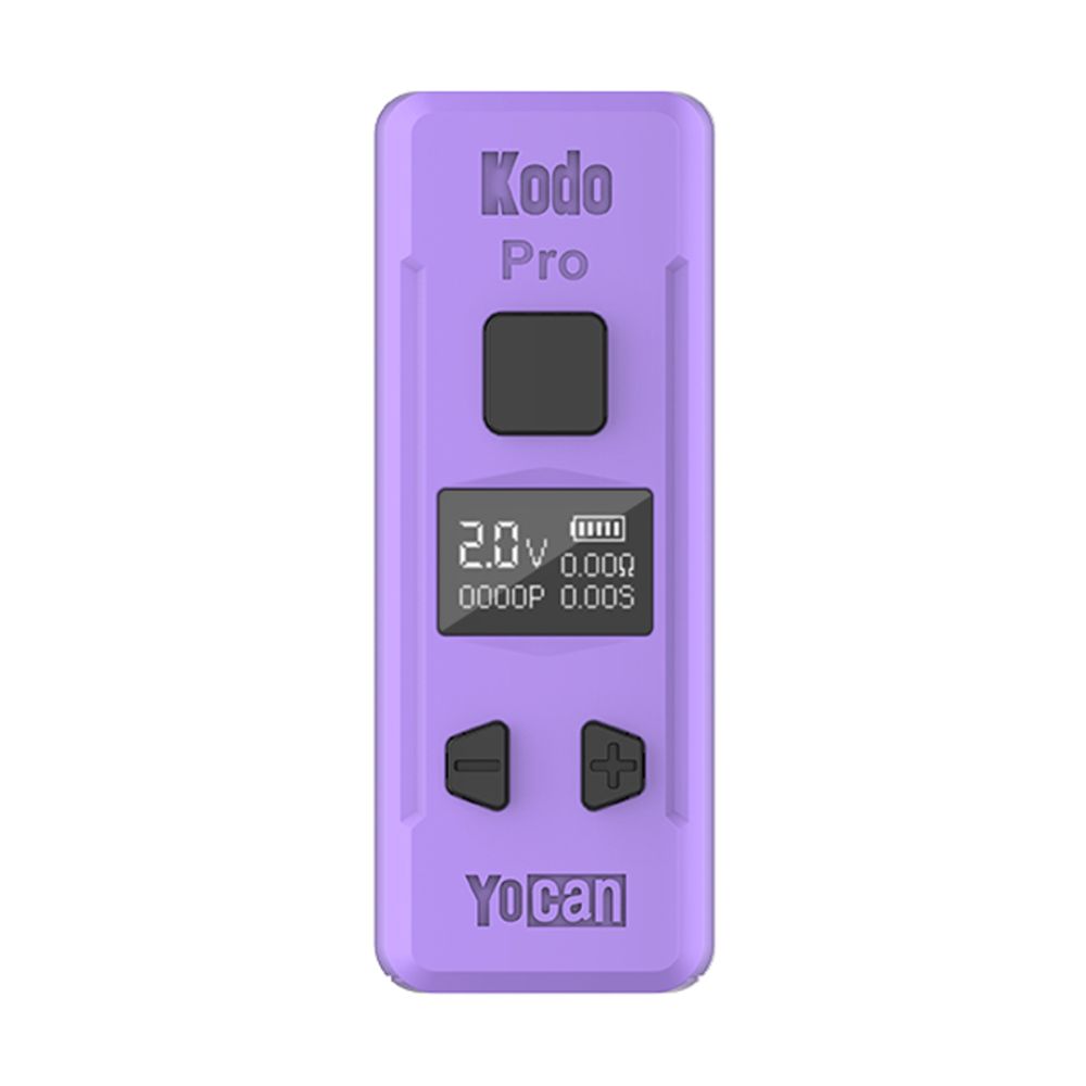 The Yocan Kodo Pro is an ultra-tiny 400mAh 510 thread battery with OLED display, 0.1V precision voltage (1.8V–4.2V), puff counter, and preheat for customized cartridge sessions.