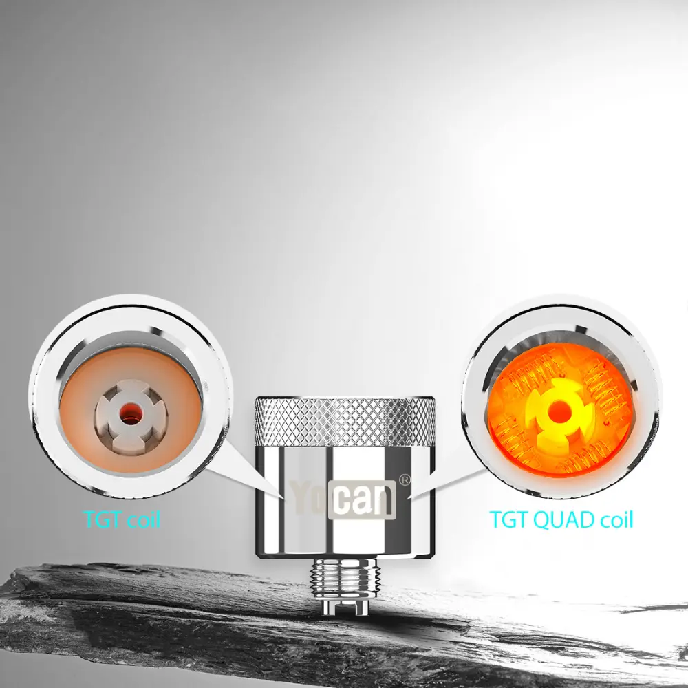 The Yocan Pillar comes with 2 different coils. The TGT coil combines ceramic donut and quartz XTAL rod. There’s no exposed coil, so your concentrate won’t go straight onto a coil. Instead it will heat on the ceramic donut, and then melt into the XTAL rod. The TGT Quad coil has 4 coils, which delivers the higher vapor production of the two. The TGT Coil Resistance is 0.4-0.5Ω. You can buy replacement Yocan Pillar TGT Coils here.