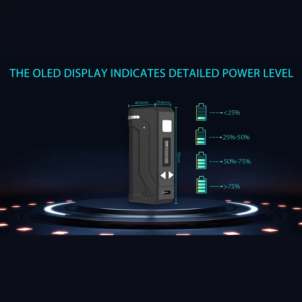 The built-in 900mAh battery capacity is USB-C rechargeable, simply plug in the Type-C charging cable (included). There is a wide voltage range of 1.8V-4.2V. Simply use the (+) and (-) adjustment buttons to set your precise temperature. This is displayed on the OLED display screen along with your other settings, such as the pre-heat feature.