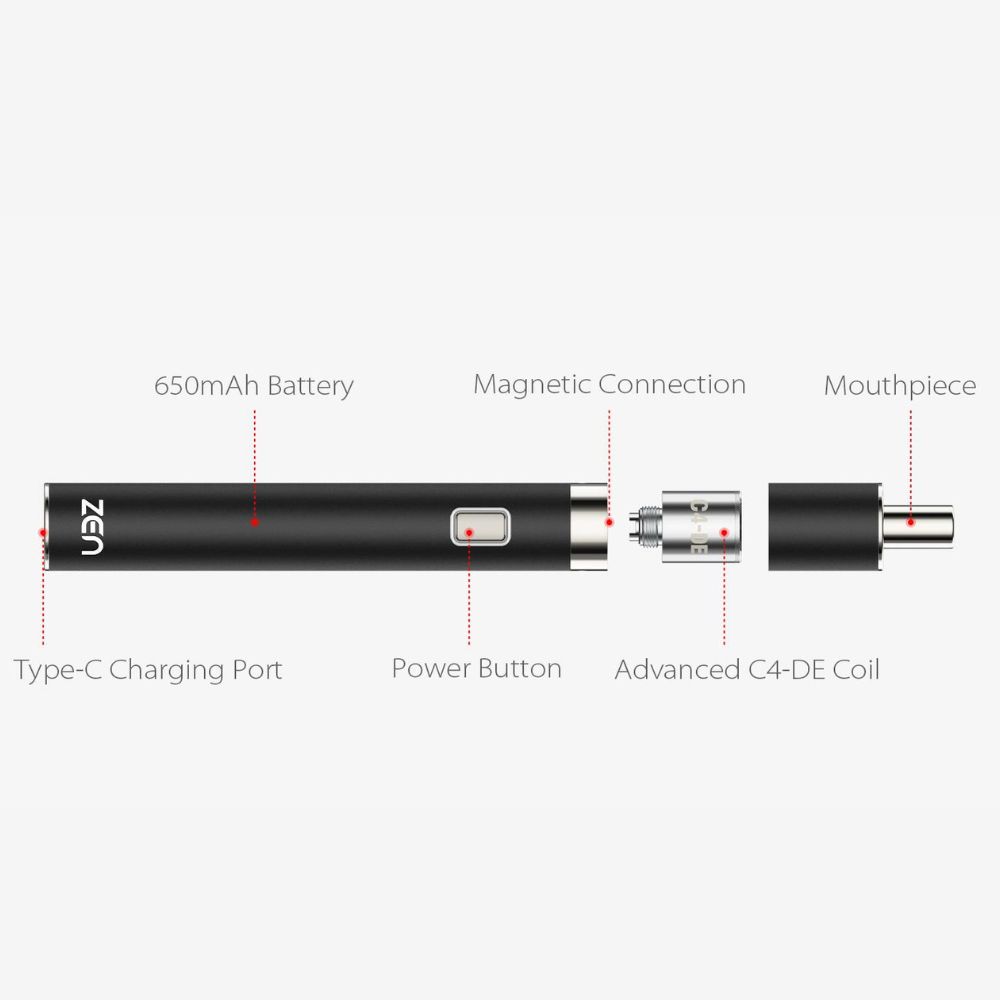 The Yocan Zen uses C4-DE coils which have a premium ceramic and DE (Diatomaceous Earth) construction. These evenly heat and vaporize your waxy concentrates, releasing all the active ingredients so you enjoy the full flavor spectrum. The DE material helps with fast heat-up speed (compared to usual ceramic coils) and heat retention. The coils have a 510 thread making it easy to swap them out – Replacement Yocan Zen coils are available here!
